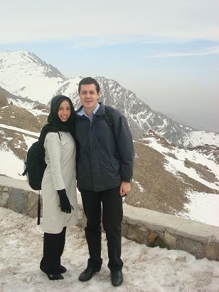 No ponto mais alto, já totalmente coberto por neve, havia um abrigo e diversas estudantes em uma espécie de excursão. No momento em que elas descobriram que éramos estrangeiros, fomos assediados como celebridade. Elas cercavam a Juliana para tirar fotos e faziam um monte de perguntas impossíveis de entender ao mesmo tempo em que elas apreciavam sua aliança e faziam o entrelaçamentos dos dedos mindinhos. Suponho que se tratava de algo relacionado ao casamento. Elas ficaram ofegantes, alvoroçadas. Nos cercavam estéricas. Algumas tentavam praticar o inglês com as mesmas perguntas “step-by-step”. Quando falamos do Brasil, novamente os gritos de Káká, etc, Eu perguntei: “E o Lula?” Elas: “Lula? No. Káká, Ronaldo, etc”. Apesar da euforia, curtimos a vista e as velhas brincadeiras de neve. A volta foi tranqüila, mas cansativa. Antes de chegarmos ao hotel, passamos no Museu dos Mártires, onde eu supunha encontrar fotos e documentos da guerra Irã-Iraque, conforme haviam me informado. Não encontramos nada sobre isso, apenas um passeio sombrio, regado à música fúnebre islâmica, em três andares de histórias tristes de pessoas que morreram em guerra ou na revolução. Importante frizar que esse museu fica em frente a antiga embaixada dos EUA (atualmente abriga o quartel general da revolução islâmica). A maior parte estava escrita em Persa, para facilitar. Essa parada exigiu que acelerássemos o passo. Corremos de volta ao hotel (estamos ficando craque nisso e posso dizer que vicia – me faz lembrar da minha vida de office-boy quando eu tinha 14 anos, coisa que ninguém acredita, só o Renato, meu irmão, porque foi quem me arrumou o emprego) desviando das motos e muita gente (o Irã é considerado um país populoso com 70 milhões de habitantes e vem crescendo aceleradamente desproporcional ao seu tamanho. O metro, ônibus e ruas estão sempre cheias de gente. Fila é comum. As mulheres, apesar de ficarem separadas nos transportes, ao contrário do que se imagina, o que daria mais conforto, ficam na verdade comprimidas. A separação está desproporcional).