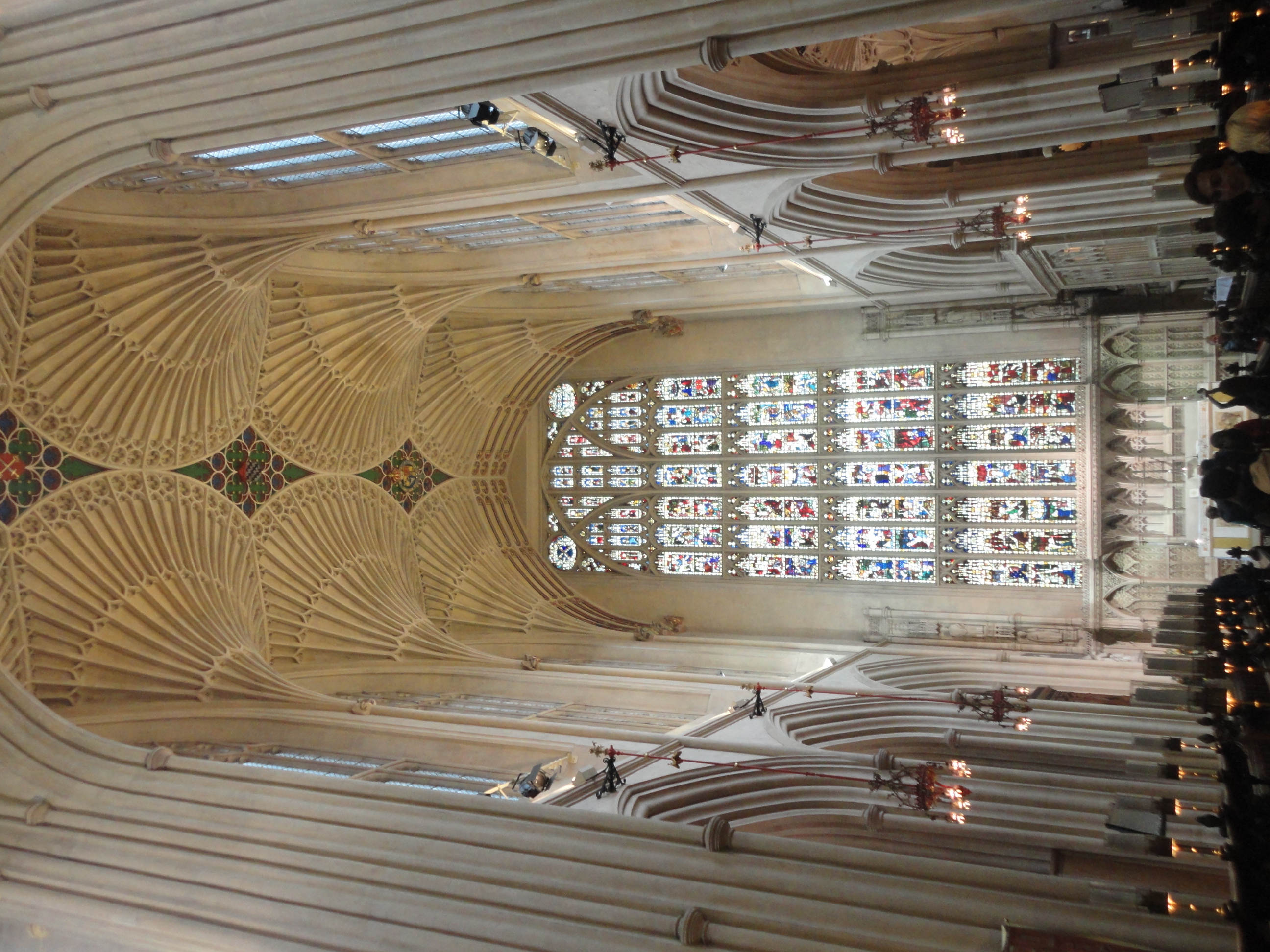 original complementada pela construção mais recente (não tão recente, mas depois da ocupação romana). Logo depois do passeio pelo Roman Bath, entramos na Bath Catedral ( ou Bath Abbey), uma belíssima igreja construída em 1499 e que pertence a igreja anglicana da Inglaterra. Se você ficar mais de uma hora nessa igreja provavelmente sairia corcunda, pois as seu teto( ou sua nave) chama a atenção pelos efeitos do desenho geométrico em toda a sua extensão.