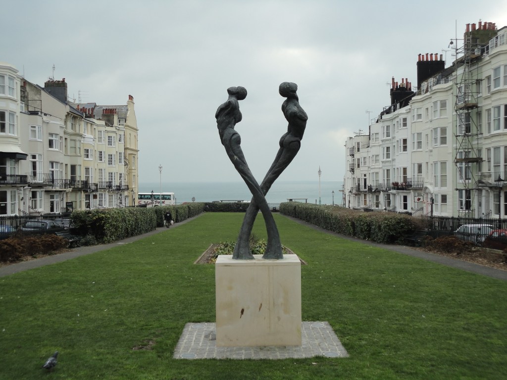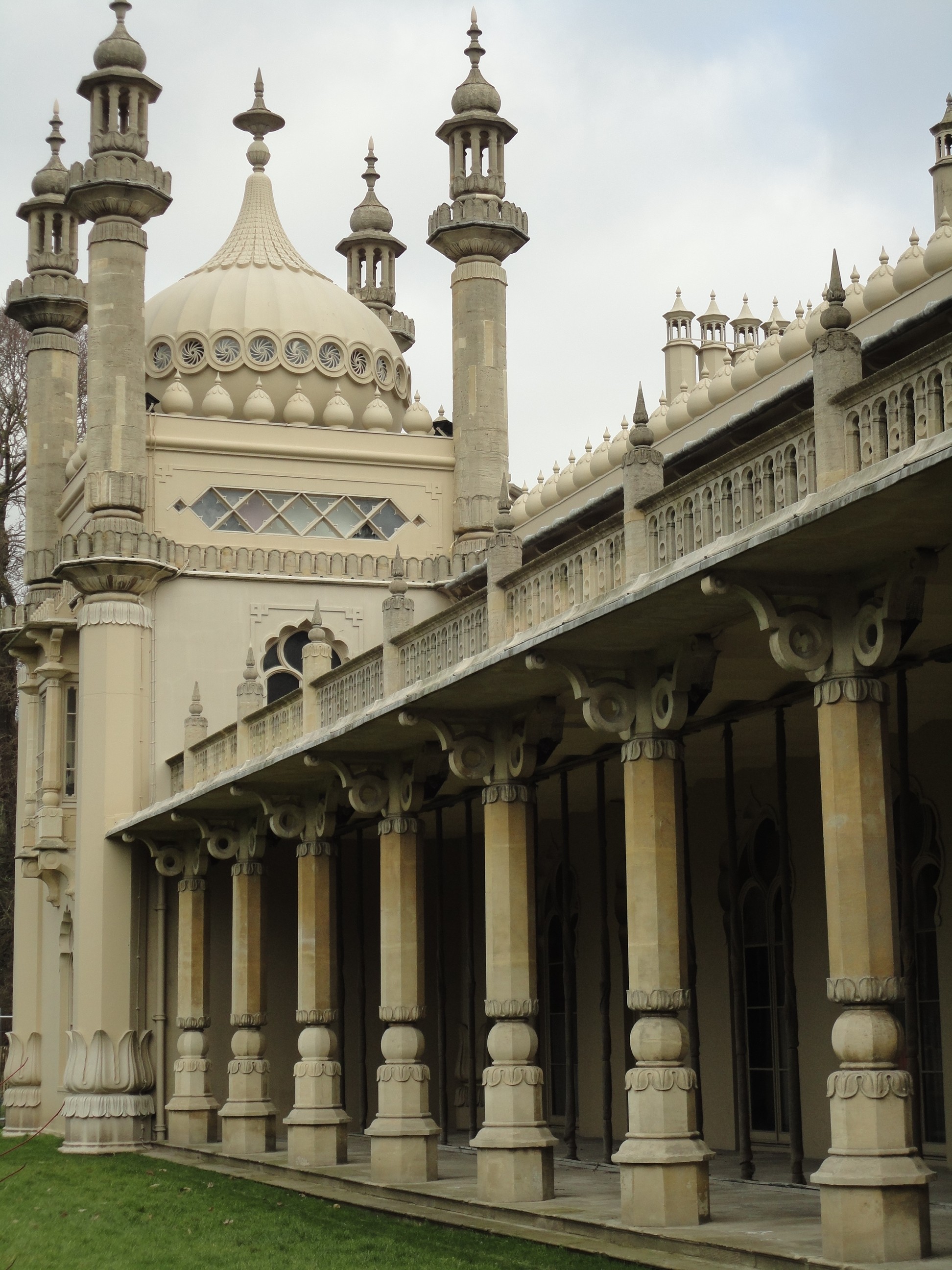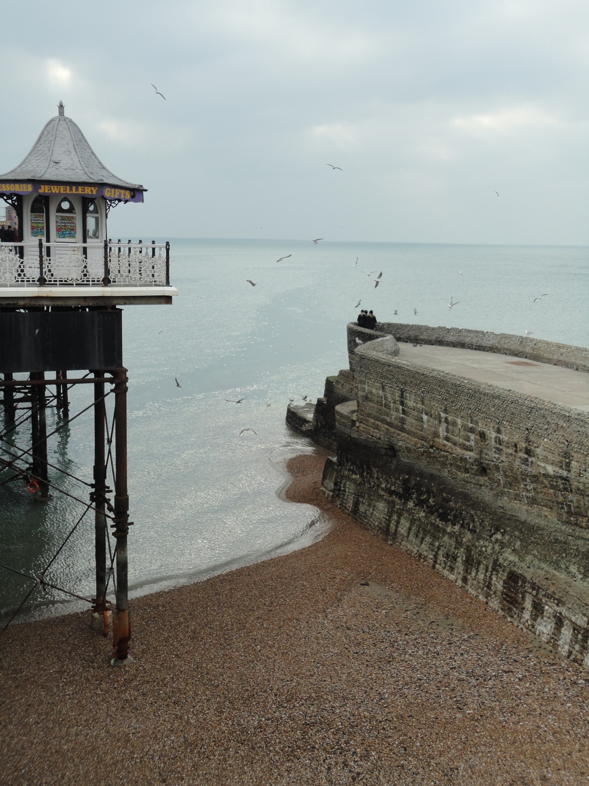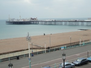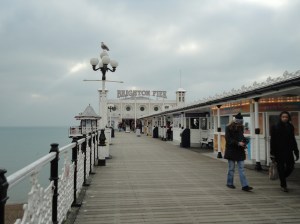 Mancha. Por um lado, cidade veraneio, com praias e tal, e também cidade dormitório. Esta cerca de 1 hora de trem de Londres.  Como cidade veraneio já da para imaginar que no frio ela tem outra cara. O vento gelado do mar serve como um animador de circo para quem está dentro dos cafés na beira da praia tomando chocolate quente. Para quem está lá fora buscando conhecer a cidade é necessário tentar esquecer o frio e sorrir para as fotos. Nossa primeira visita foi ao centro da cidade, onde a atração principal é o Píer, hoje abrigando um parque de diversão e uma feirinha bem simples e tradicional de qualquer praia do mundo. Depois do Píer, uma passadinha no Royal Pavilion, o palácio Real construído no século XIX, e uma visita ao museu de