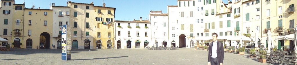 Chegamos em Lucca quase meia noite. O nosso hotel ficava localizado dentro da cidade medieval. A Lucca antiga é uma mini cidade medieval, dentro de uma muralha construida entre 1500 e 1600, ainda preservada, que oferece uma atmosfera arquitetônica e um modo de vida totalmente fora da correria da vida moderna.  Quando ainda estávamos na cidade moderna prestes a entrar na cidade antiga, chegamos a comentar que parecia se tratar de um condomínio fechado “medieval”, não muito diferente de um Alphaville. Nosso hotel estava instalado numa área bem privilegiada, próximo a praça principal, do lado de dentro das muralhas. Naturalmente era um hotel num prédio antigo – difícil prever o ano de sua construção – mas devido ao seu tamanho, quantidade de salas imensas,  lugares escuros e ambientes silenciosos foram suficientes para despertar a imaginação.  Isso foi uma espécie de diferencial. Giovanni, o recepcionista, ascensorista, guardador de malas e vigia do hotel, foi muito atencioso em seus serviços, o que incluiu indicar lugares maravilhosos pela cidade para tomarmos café da manhã. Infelizmente não seguimos sua dica, e acabamos tomando café numa ala anexa ao hotel. O café da manhã foi mediano, cumpriu parcialmente seu papel. Mas quando saímos pela cidade, vendo as ruas estreitas, os italianos andando naquelas bicicletas antigas carregando bengalas e pão doce, o cheiro das maravilhosas padarias em pequenas portinholas, ecoaram como uma brutal decepção quando comparamos com o café da manhã que havíamos tomado.