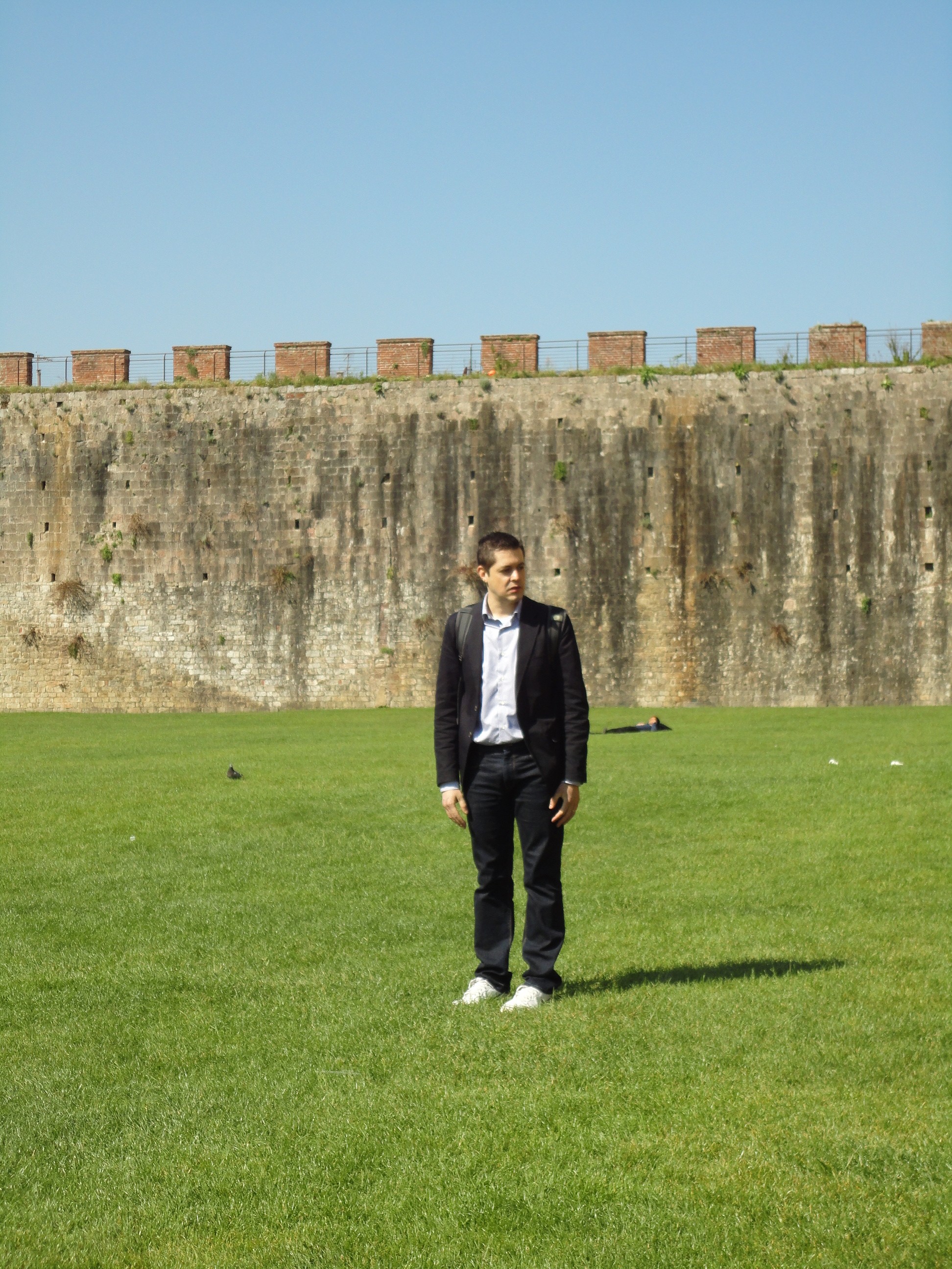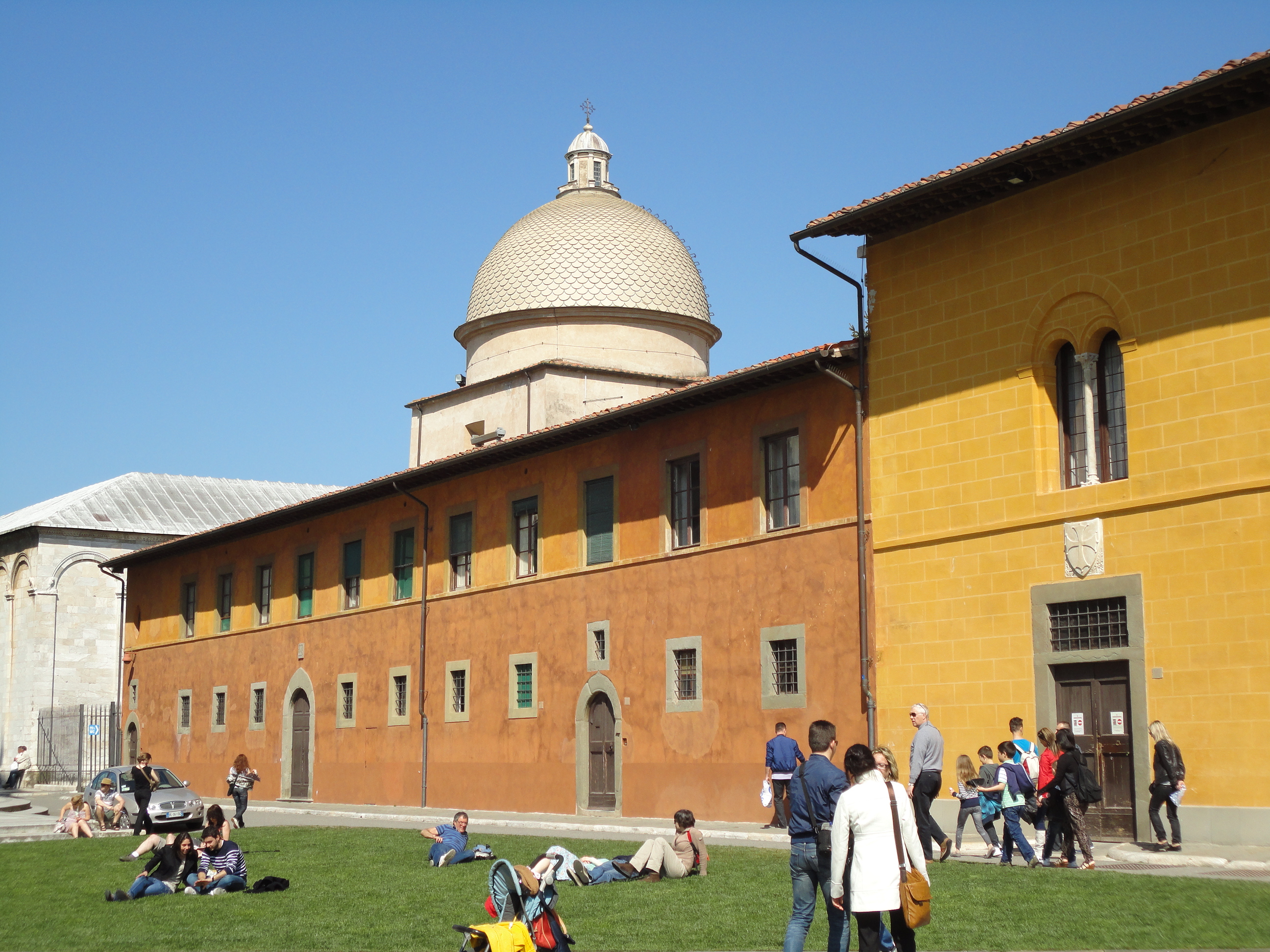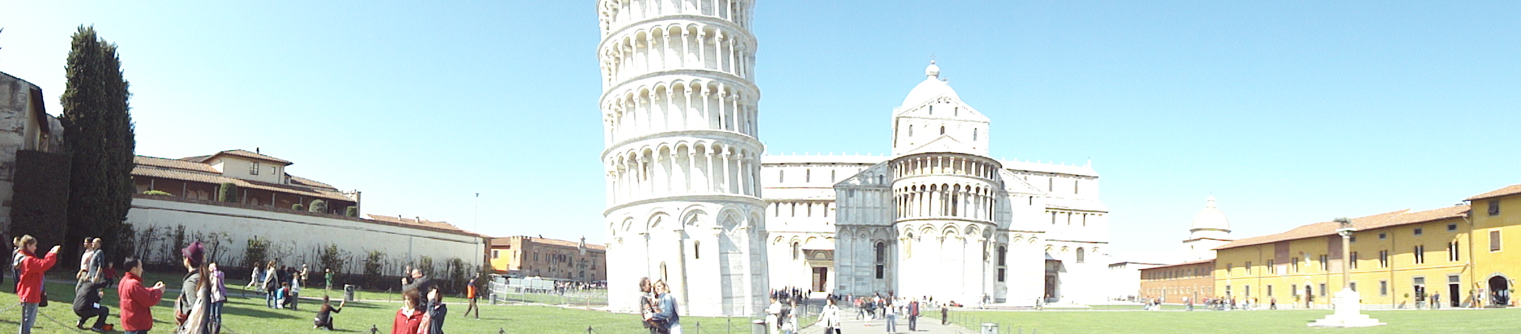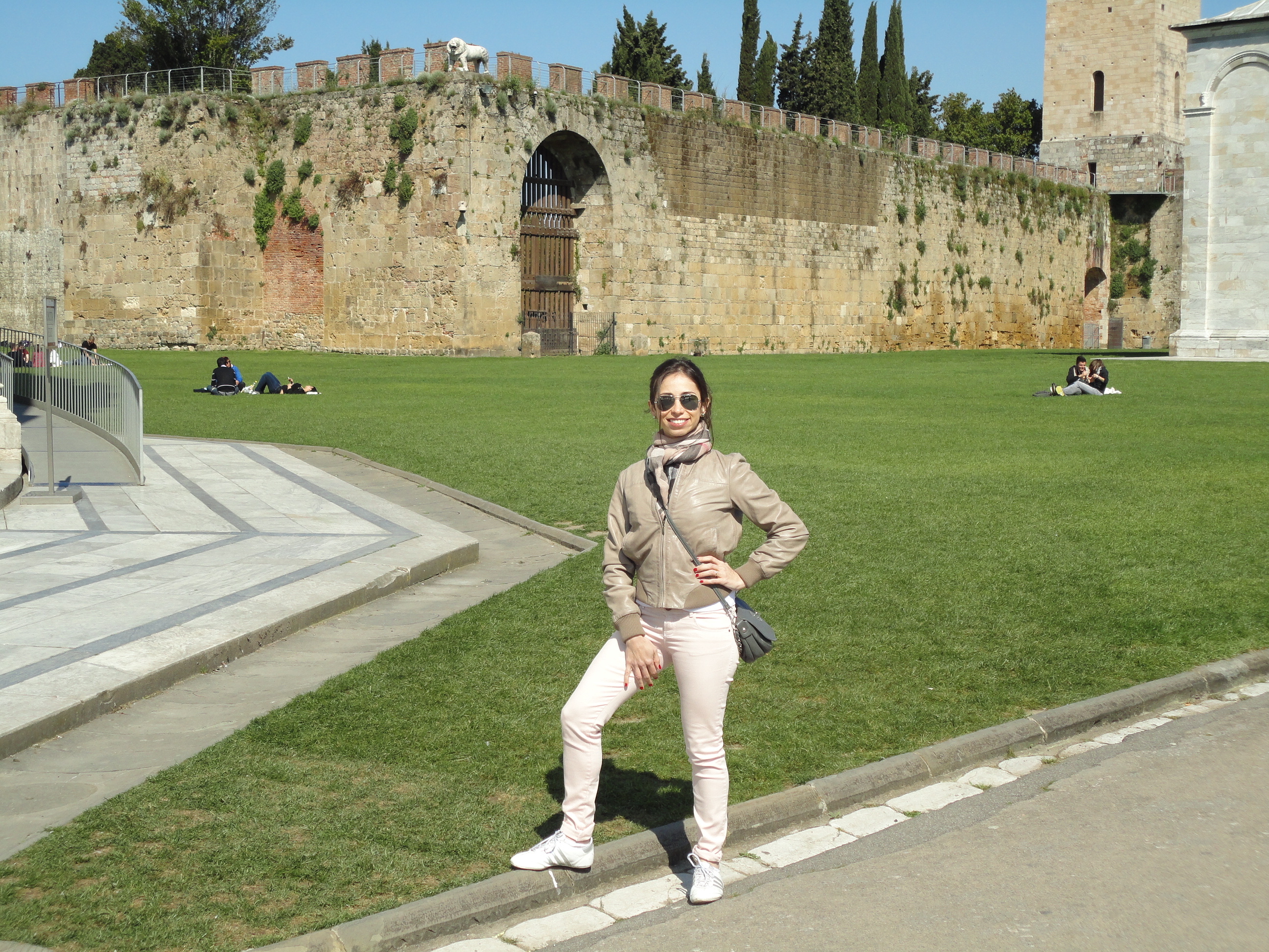 Seguimos viagem até Pisa. O percurso de 30 minutos foi muito agradável devido aos belos campos cheios de flores e árvores do mediterrâneo pelo caminho. O sol também contribuía. Não demorou muito estávamos de cara com a torre de Pisa, o acesso mais fácil que imaginávamos. Normalmente as pessoas passam por Pisa apenas para tirar foto da famosa torre torta. Daí normalmente fica apenas aquela imagem da torre ao fundo. Mas o lugar tem muito mais que a torre. Mesmo em volta da torre, tem um gramado verdinho, um convite a um “pique-nique” ou ao simples “sentar e contemplar” outros três monumentos renascentistas(o que inclui o Duomo ou Catedral de Pisa) e uma muralha medieval cercando a cidade antiga.  A brincadeira fica por conta de quem tira a melhor foto da torre. Uns ficam segurando ela pelo ar, outros abraçam,. Etc. Para quem não sabe, a torre foi calcada por baixo e não vai inclinar mais dó que  já está.
