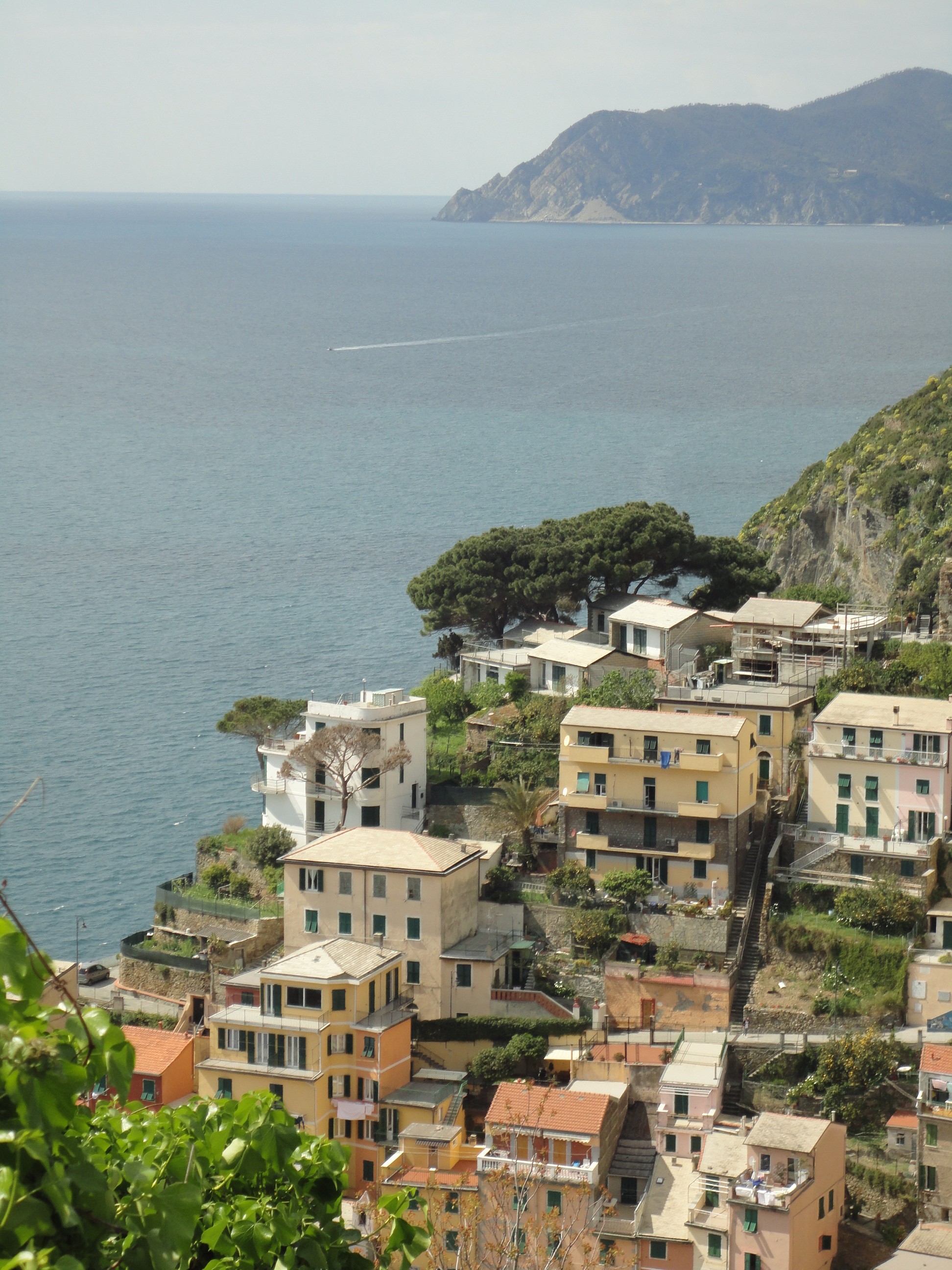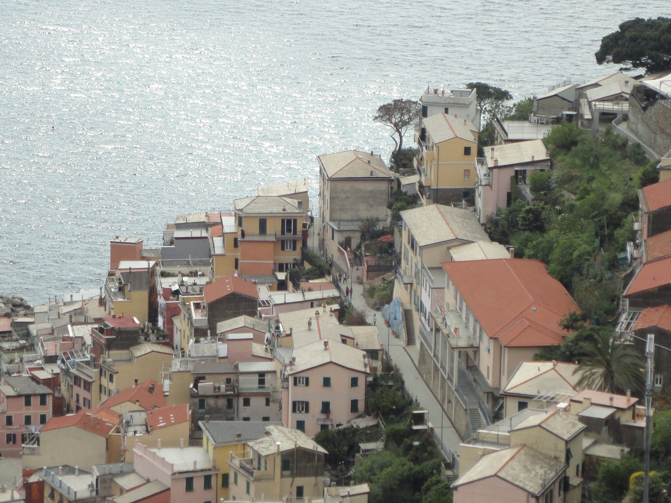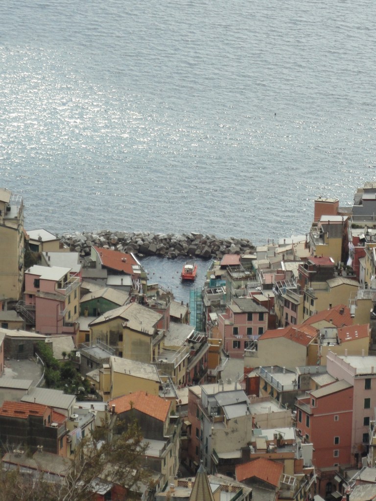 Em La Spezia demos uma voltinha rápida pelo píer, no centro da cidade. Mas logo fomos buscar um lugar para comer. Tivemos sorte. Aleatoriamente resolvemos entrar por um restaurante familiar bastante aconchegante bem em frente ao mercado a céu aberto no centro da cidade. Saímos com a sensação de que realmente havíamos provado o sabor da Itália, feita pelas mãos de uma família italiana, em cozinha caseira. Com as energias renovadas, paramos logo em seguida no alto de uma montanha onde podíamos avistar toda a cidade. Foi uma parada para tomar café, sem cafeteria. Daí seguimos para a estrada estreita ziguezague, beirando o penhasco,  margeando o belíssimo mar da Ligúria para chegarmos nas graciosas vilas de Cinque Terre.  A primeira vila era a de Riomagiore.  Paramos na estrada, numa parte alta que podíamos avistar a vila, as montanhas e o mar ao fundo. São vilas de pescadores de difícil acesso, feitas de casas ou predinhos de três andares coloridos, com  varandas e janelas enormes de madeira, com roupas ou toalhas de mesa estendidas. As casas são aconchegadas na montanhas. Puxa, eu não queria dizer isso, eu não queria dizer, eu não queria dizer isso, mas realmente parecem “favelas de luxo”. Desculpe-me, eu falei. Não estou depreciando, mas essa também é uma constatação. Mas não estou dizendo isso negativamente, pelo contrário. Realmente é muito bonito. Normalmente as pessoas chegam de trem, diretamente dentro da vila, sem ter a oportunidade , as vezes, de ver a vila de longe. Também fazem caminhadas entre as vilas, cortando as montanhas. Como não tínhamos tempo, continuamos nosso percurso, até Vernazza, outra vila. Dessa vez resolvemos descer a pé até o mar. Trata-se de um percurso muito agradável, onde é possível ver as plantações de olivas pelo caminho até chegar na Vila.  Depois de chegarmos pertinho do mar e sentir a “agitação” do lugar, bastante movimentado pelos turistas que chegavam e saíam de trem, passamos por um café de um italiano casado com uma brasileira, logo na saída da vila.