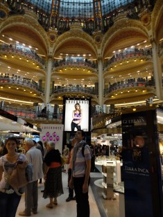 Tratava-se do restaurante onde havia sido filmado o “O fabuloso destino de Amelie Poulain”. Bem agradável e ainda guarda realmente a configuração do filme. Isso também nos ajudou a andar pela região e ver uma Paris que ainda não conhecíamos.E não conhecíamos muito coisa. No dia seguinte pela manhã procuramos percorrer por ruas que ainda não conhecíamos. Daí nos permitiu conhecer o Centro George Pompidou. Trata-se de um prédio “centro cultural” sem dono. Livre para se criar e circular. Um marco da arquitetura pós-moderna. Existe algo que lhe configura como um prédio democracia cultural, algo que orgulha os franceses. Depois passamos Notre Dame e pela ilha de São Luis, onde procuramos em vão por uma sorveteria “famosa”. Seguimos caminhando até as Galerias Lafayette, provavelmente o maior templo capitalista da terra. Um shopping de altíssimo luxo. Não só pelas lojas que são altamente atrativas, olfativas e visuais, mas também pelo desenho das paredes, lustres, vitrais, que transmite uma conotação de templo, igreja, catedral… do consumo. Não combina muito, mas esse é o fato. O capitalismo acentuado em “templo”. Seguimos pela Av. da Opera cruzando a Opera de Paris, ou o Opera Garnier, uma obra prima a céu aberto e deparamos também com a Igreja de Madeleine, uma suntuosa catedral que começou ser construída em 1764. Daí seguimos pela Rue Du Faubourg-Saint-Honore, onde além de ser a residência oficial do presidente da França, também estão localizadas as famosas lojas de perfume, roupas de luxo, embaixada e obras de arte. Esbarramos com o Louvre, mas dessa vez aproveitamos para explorar o jardim externo. Seguimos por outras ruas desconhecidas até desembocar, no final da tarde, deslumbrantemente, por uma vista que nunca imaginaríamos existir, da lateral da Torre Eiffel. Trata-se de uma ruazinha de bairro, discreta e perdida no mundo (se não fosse ali, claro), uma ligação entre a Av de La Bourdonnais e a torre, uma ruazinha desemboca discretamente num jardim embaixo do monumento. Ficamos de boca aberta. Isso porque normalmente chega-se a torre pela frente ou por trás, ambos seguindo grandes fluxos turísticos.