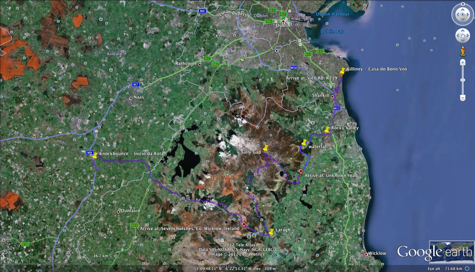 No Caminho de volta para Dublin havíamos programado em passar em dois lugares. O primeiro foi o castelo “Rock of Cashel”, ou “Fortaleza de Pedra”. Trata-se de um espetacular sitio arqueológico, no topo de um montanha com uma vista maravilhosa para a cidade. Em torno da Fortaleza foram encontrados vestígios que datam do século IV, sempre relacionados de alguma maneira com guerras e disputas territoriais. O segundo passeio não era bem uma parada, mas um tour. O percurso começa em Naas. Só pode ser feito de carro. Preferencialmente quando o tempo está bom, em qualquer estação, exceto no inverno (quando realmente neva). Trata-se de um passeio de 1 hora e meia a duas horas, um percurso de tirar o fôlego, tem tantas paisagens diversificadas criadas pela natureza. Em alguns momentos você vai se sentir no paraíso. Em outro momento, de tão silencioso e inóspito que passa-se a pensar que está em outro planeta. São lagos, vales de cores avermelhadas, pequenos córregos percorridos por ruas estreitas. Essa região engloba os percursos conhecidos como Sally Gap e Military road. No trecho conhecido como Military Road, na metade do nosso percurso, depara-se com uma cachoeira de uns 50 metros de altura, fortalecendo ainda mais a sensação de que está no paraíso. Dalí para frente o percurso fica colorido de flores, cruzando o indescritível Rock Valey até chegar a estrada que liga Riverside até a praia de Killiney, mais precisamente, na casa do Roqueiro Bono Vox. Isso mesmo. A mansão do músico, no alto de um pequeno morro em frente a praia é o final do percurso. O percurso todo acabou sendo um algo do acaso. Não havíamos planejado todo ele. Os trechos foram se rearranjando harmonicamente tendo Dublin como direção de volta. Terminar na casa do Bono, por exemplo, foi realmente uma coincidência. Poucas vezes faço uma recomendação por aqui. Mas essa quero deixar realmente registrada para ser justo como os Irlandeses. Batizamos esse percurso de Caminho da Lori. Isso é geografia nos pés. Para facilitar – que o trecho seja seguido – estou colocando um mapinha aqui do lado. Mas só vale a pena mesmo fazê-lo com esse começo, meio e fim. E garanto que só esse passeio vale toda a viagem à Irlanda. Quer fazer de bicicleta? Bem, certeza que eu farei um dia.