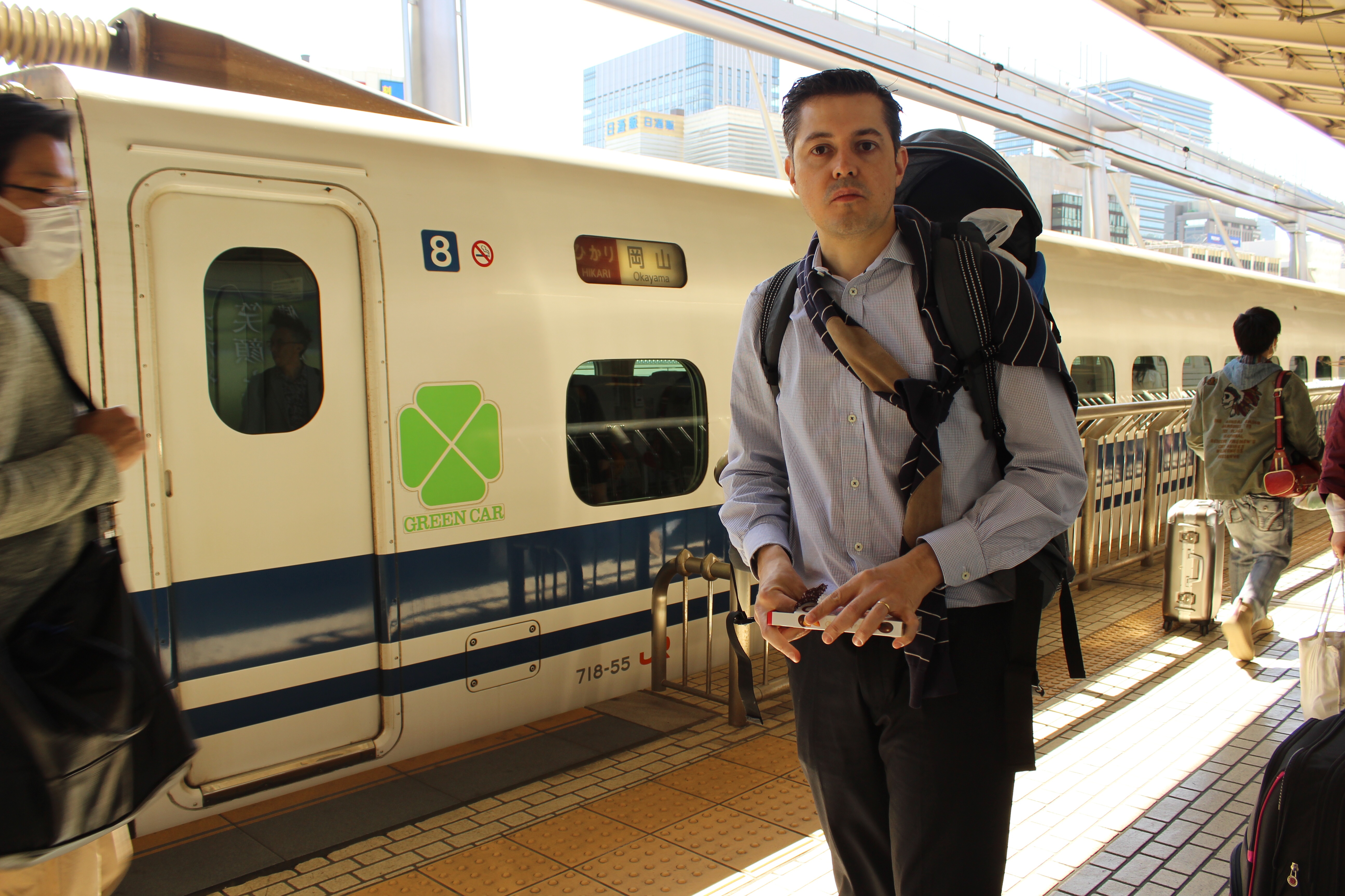 Na segunda feira de manha, sabendo que o tempo estaria bom, resolvemos sair um pouco de Toquio e conhecer um pouco outras cidades. Compramos o bilhete do Trem Bala(oficialmente chamado aqui de Shinkansen) para Osaka. O tempo bom é condição necessária para poder ver o Monte Fuji, um vulcão inativo, que fica no meio do percurso. Até o momento de nosso embarque só havíamos visto trem bala quando ele estava se movimentando pela cidade, chegando ou saindo. A primeira viagem a gente nunca esquece. A estação de trem de Tóquio, onde começa a viagem é mais imponente por fora do que por dentro. O local de embarque é bem modesto tendo em vista a magnitude do trem. Gostaria de ter uma definição mais original, mas acho que não a encontrei: o trem bala japonês é um avião sobre os trilhos. Pelo formato do trem,e pela porta de entrada. É um servico fenomenal. Altíssima velocidade, conforto e uma cobertura geográfica consideravel. Logo que saímos da estação de Tóquio, ainda na cidade pudemos avistar o Monte Fuji. O trem chega a passar em frente ao Monte o que lhe garante um passeio inesquecível. Você fica fascinado com a paisagem. Tivemos muita sorte de pegar toda a paisagem limpa.
