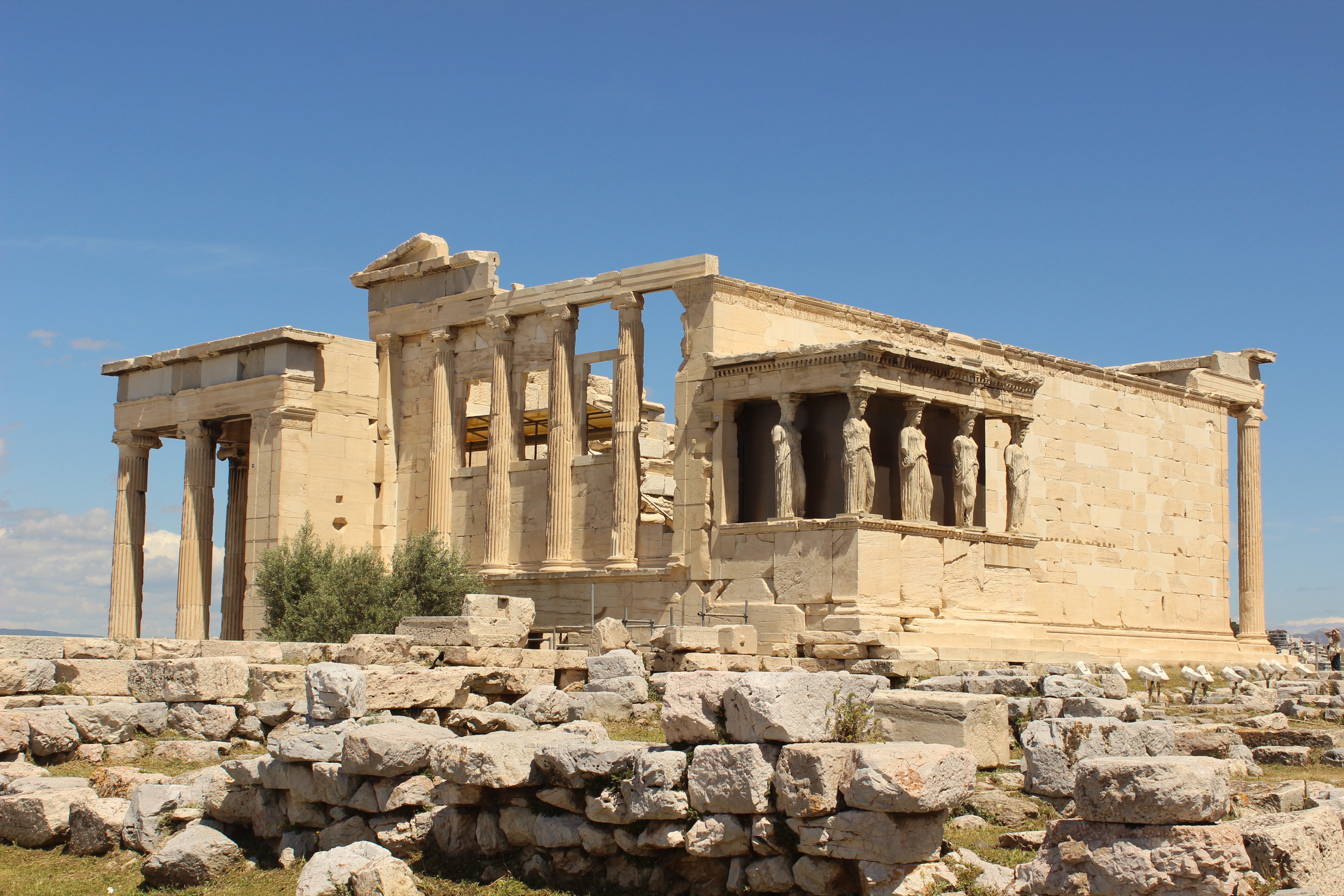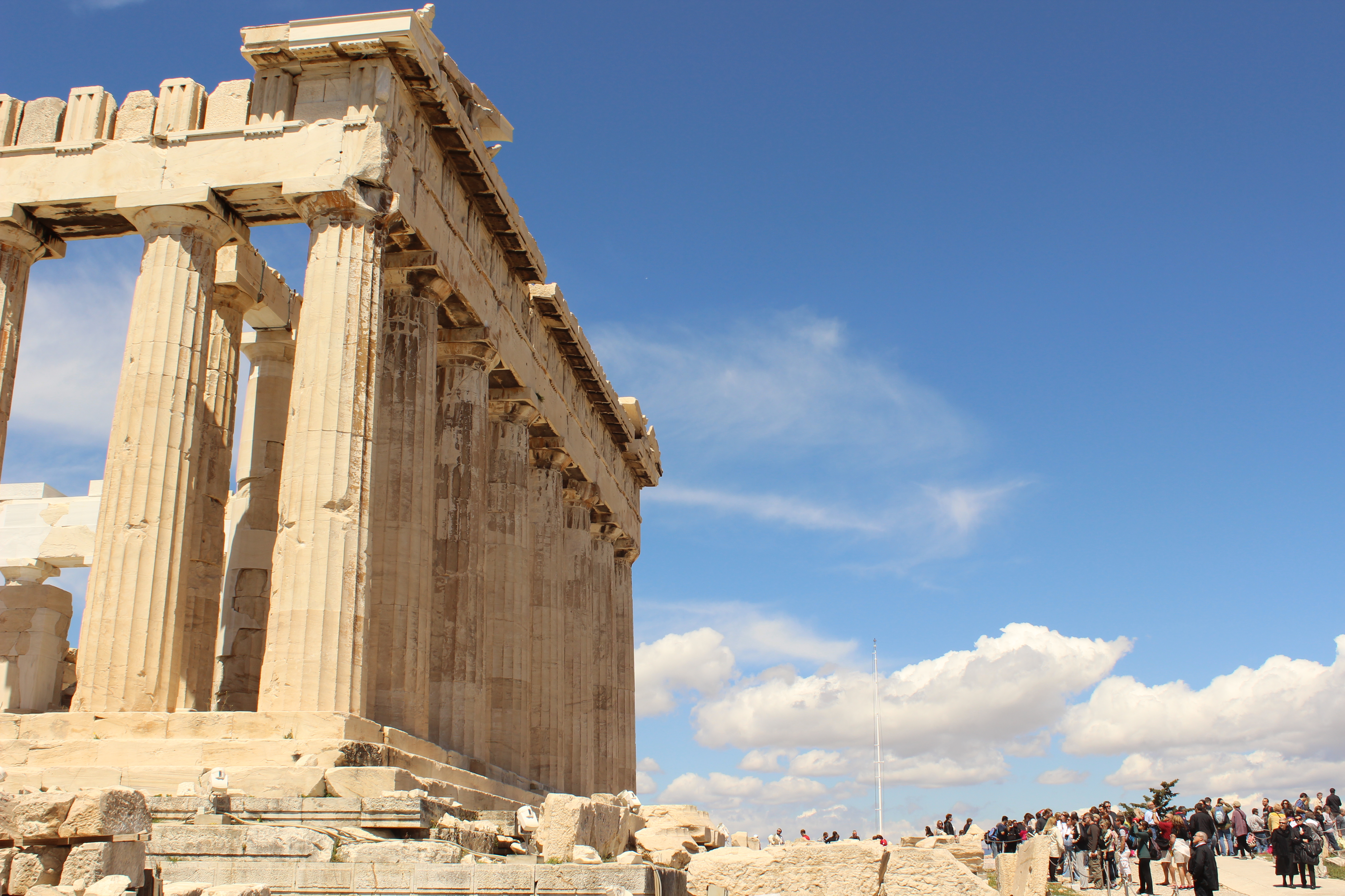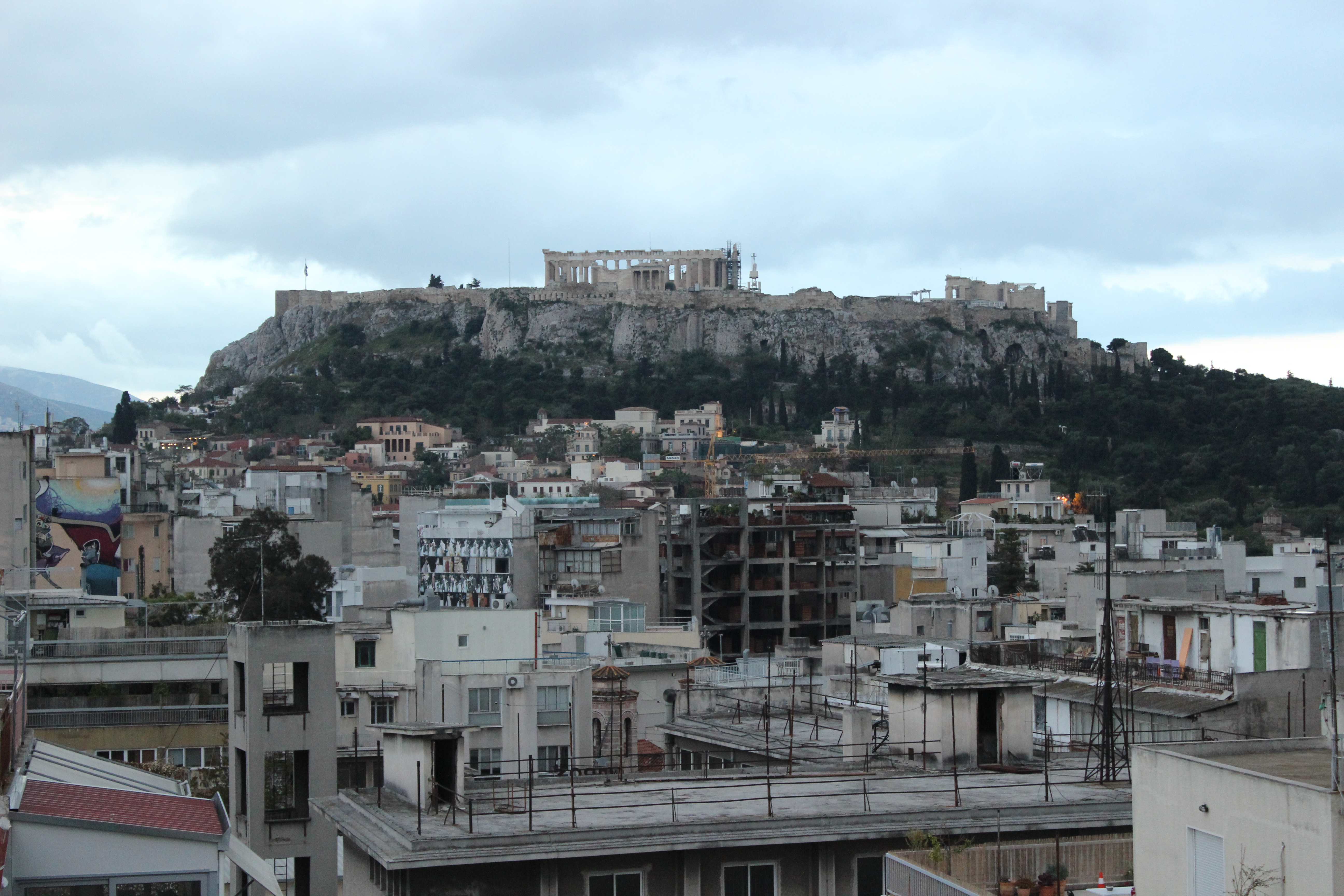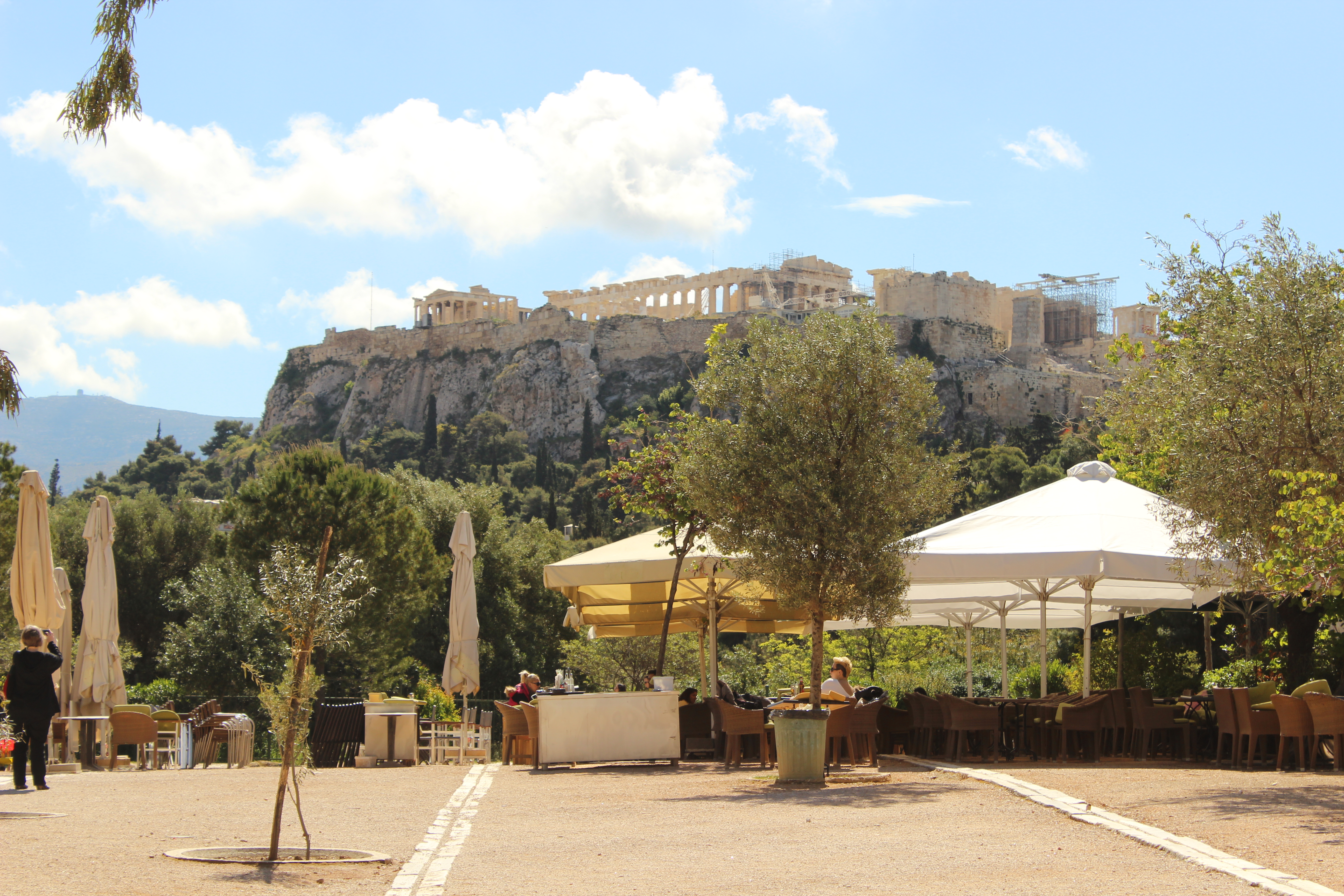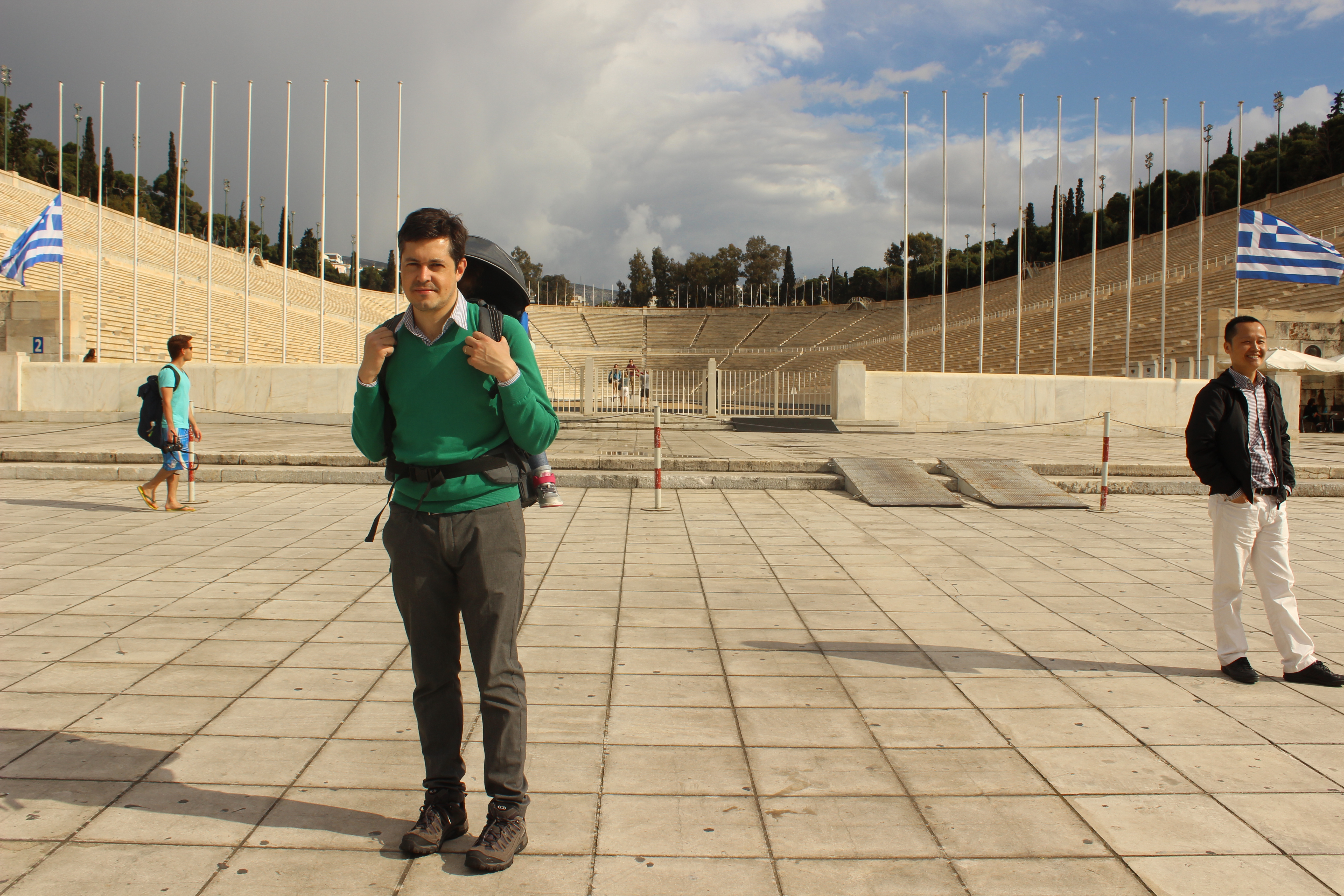 Estávamos planejando tomar nosso café da manhã em uma delas, mas fomos surpreendidos pelo café da manhã servido em nosso hotel meia estrela. O café é servido no último andar e tem uma vista privilegiada para Acrópoles(essa mesma, a cidade de Atenas criada no século de Péricles, época dos grande filósofos). E lá foi nossa primeira parada. Felizmente estávamos usando a backpacker para carregar nossa menina. Subir a colina era uma verdadeira escalada sob um sol razoavelmente forte. Lá tivemos mais uma bela surpresa. O ingresso para toda a área da Acrópole era excepcionalmente gratuito hoje. O passeio ficou ainda mais legal. Outro benefício: pensávamos que o objetivo maior era apenas ver o berço da democracia, o Paternon, e o primeiro teatro da terra, mas na verdade o bacana mesmo foi ter a vista de toda a cidade, inclusive o mar mediterrâneo. É claro que para outras pessoas o mais importante pode ser as construções antigas já que elas influenciaram todo o mundo. Mas o fato é as pessoas em geral ficam mais tempo olhando a cidade do que propriamente as obras que influenciaram o mundo. Almoçamos no pé da colina, experimentando a comida grega com seus temperos regados de azeite. Outra vantagem. A comida é barata e convidativa. E eles não vivem só de mussaca. Dalí seguimos para Plaka, um bairro cheio de bares bem agradáveis e mesas nas calçadas e lojinhas de artesanatos e design fino. O percurso seguiu até o templo do Deus do Olímpio, lugar que havíamos visitado na noite anterior, e o Parlamento da Grécia e o estádio olímpico.