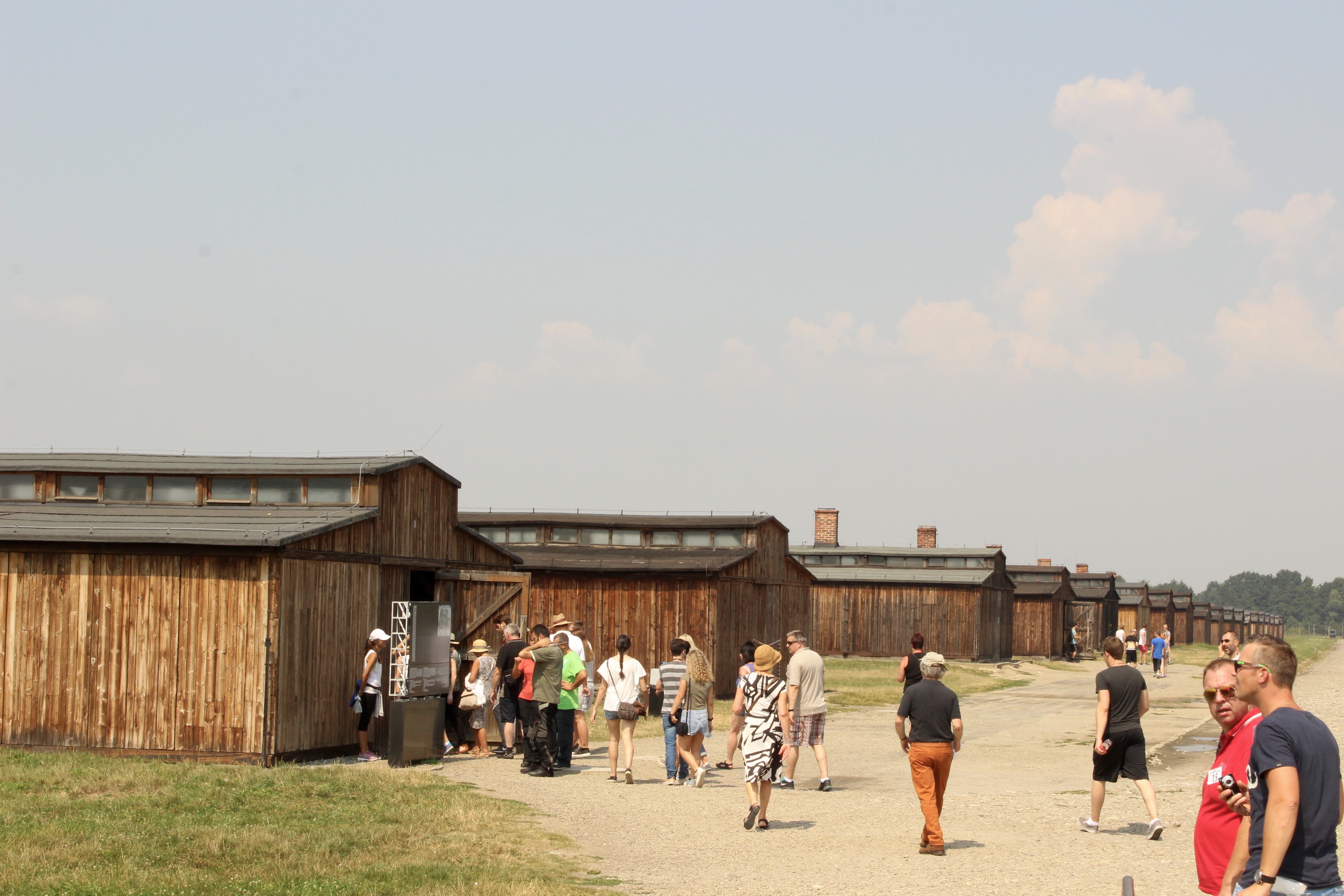 E foi assim nossa visita. E foi apenas chegando na cidade de Auschwitz que fomos saber que se tratavam de três campos de concentração. O primeiro que visitamos era uma combinação de campo de concentração e de campo de extermínio. Estava em torno de 35 graus ou mais. Um sol de rachar. Nossa menina estava dormindo e tivemos que carregá-la no colo para entrar dentro do campo. Entramos nos dormitórios, aqueles que todo mundo tem em mente devido aos famosos filmes baseados no período da história. Mas os dormitórios são muito piores do que mostrados nos filmes. São apertados e bem escuros. Os filmes criam mais espaços para justamente permitir a atuação dos atores. Mas de resto, é tudo igual. Seguimos no sol escaldante carregando nossa pequena, rente a linha férrea por onde eles chegavam e onde acontecia o processo de separação de homens e mulheres, até chegar as camaras de gás e o crematório. Eu não parava de perguntar para mim mesmo como que aquilo tudo ainda estava tão intacto desde aquela época. Parte das câmaras de gases foram destruídas, mas ainda era possível ver o formato dos prédios. Os filmes muitas vezes ajudam a sociedade evoluir quando eles recriam o ambiente do fato histórico. Os filmes nos encorajam a visitar os lugares. Mas uma vez que você já tenha assistido um filme e esteja visitando o lugar, é impossível não se imaginar dentro dele. Por mais que o local tente passar a descrição do que aconteceu ali, você sempre será afetado pela imagem do filme que você assistiu. Dessa maneira, andar por Auschwitz é também resgatar imagens de filmes tais como A Lista de Schindler. O campo de concentração é tão imenso que você pode se perder e muitas vezes se pegar sozinho dentro de um dos barracões. A sensação de estar num macabro filme é muito ruim. E essa sensação te acompanha por todo a visita e em todos os cantos. Os prédios de Auschwitz 1 se tornaram museus com os pertences das pessoas que morreram no campo. São toneladas de cabelos, de sapatos, óculos, roupas de crianças e tudo quanto é tipo de objeto. É uma visita silenciosa pelos andares e este silêncio justamente provoca uma reflexão ou tentativa de lhe trazer a experiência histórica. Acima de tudo, e isso fica bem claro, a intenção é evitar que algo tão abominável aconteça novamente.