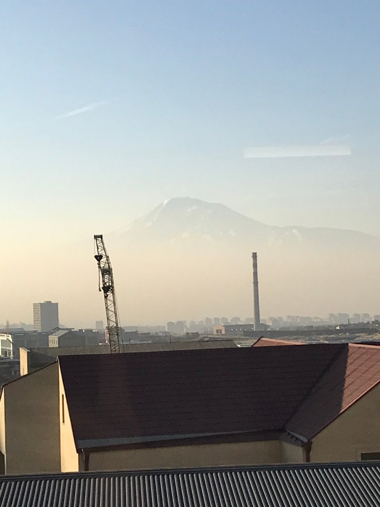 Acordamos às 8, abrimos a janela e lá estava a maravilhosa vista do pico do Ararat. O pico e seu entorno coberto de neve.