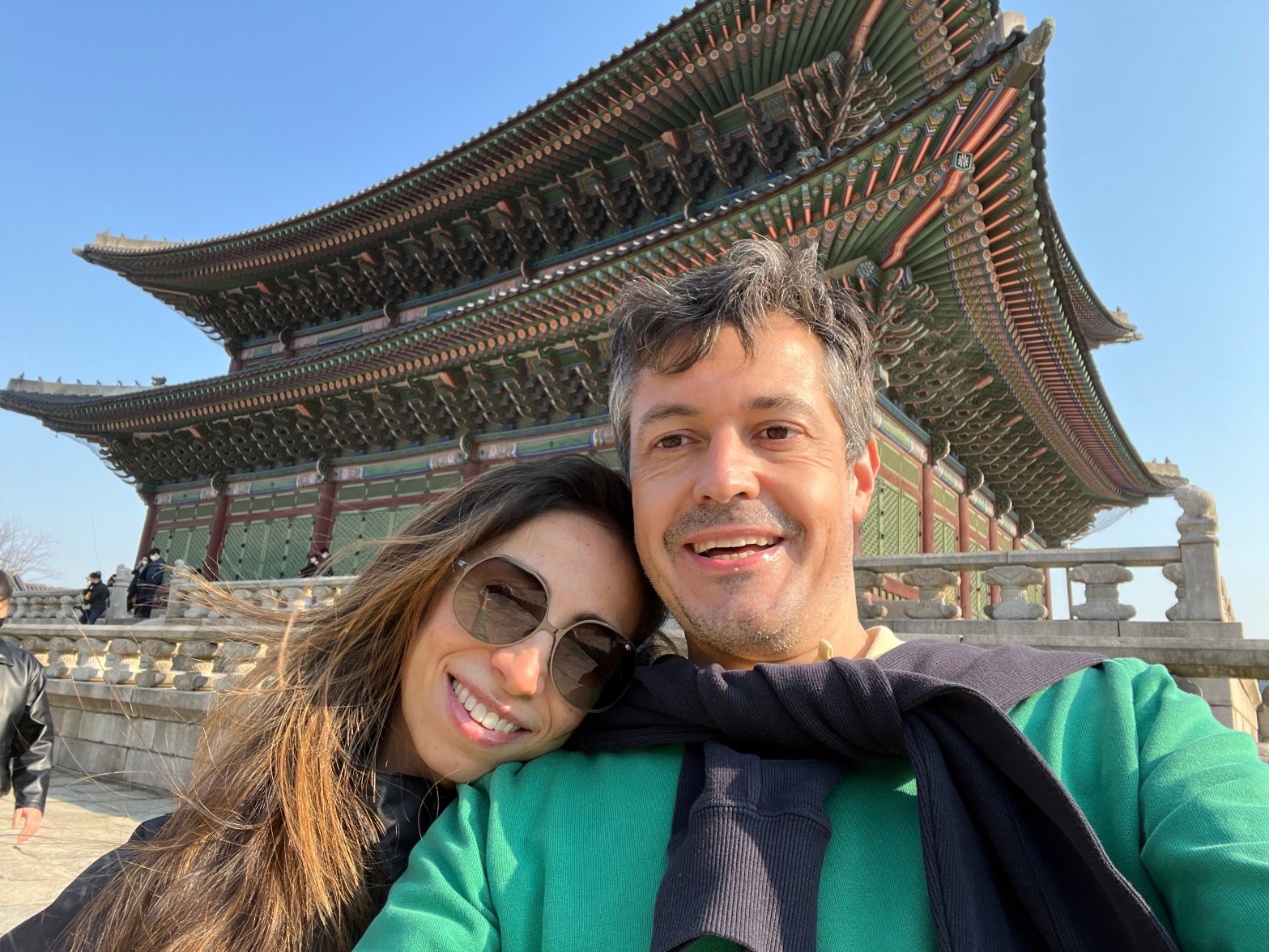 E chegamos ao palácio Gyeongbokgung. As pessoas se vestem com roupas de época. Essa é a parte mais divertida do passeio. A paisagem fica bem mais agradável, e quase não se percebe as longas distâncias percorridas dentro do parque, entre a arquitetura antiga e as pessoas. O frio estava intenso, acho que não estávamos preparados para ele. No minuto que saímos do parque tivemos que nos aquecer em um café. Café em Seoul é parada obrigatória em algum momento do dia. Em nosso caso, foi café da manhã e finzinho da tarde.