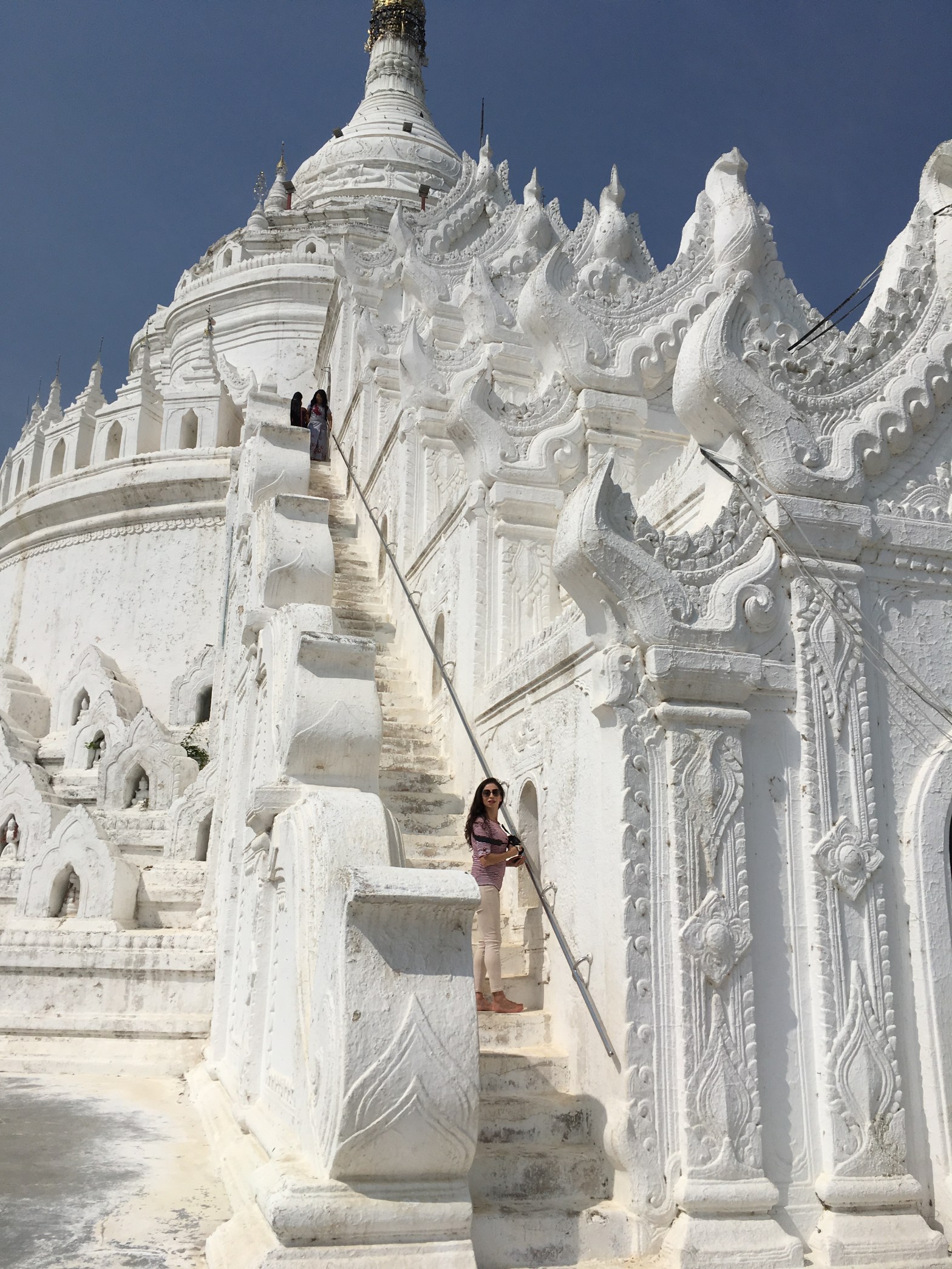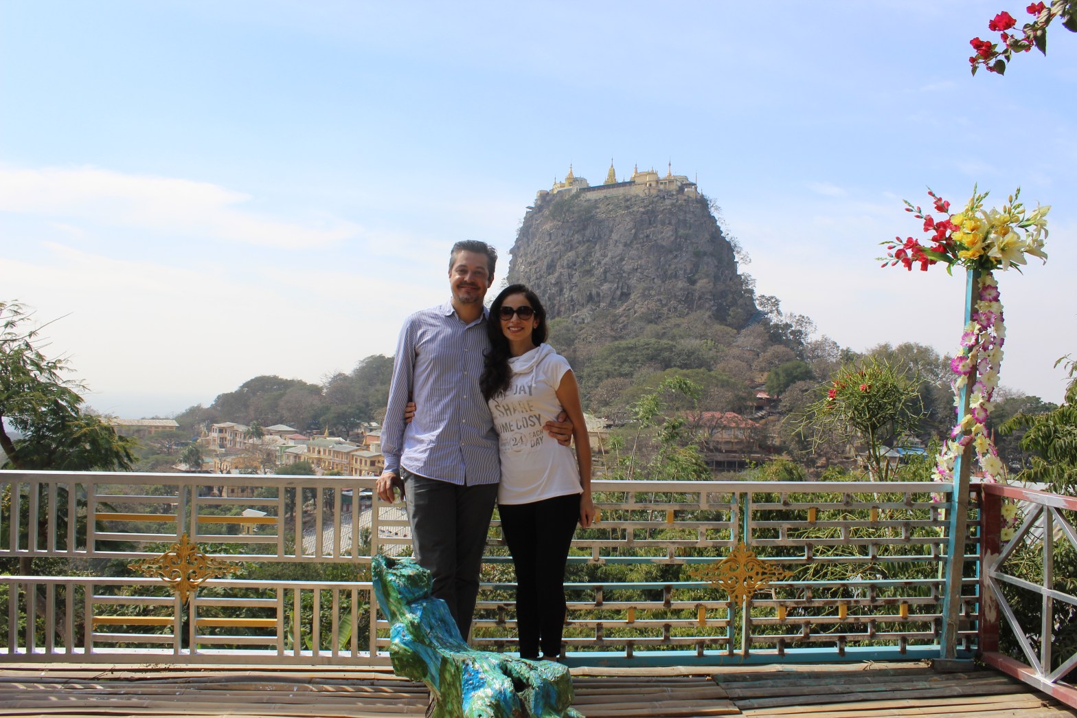 Mais uma noite em Bagan. Acordamos cedo e dessa vez, quando abrimos a porta do quarto o céu já estava coberto de balões. Ao lado do nosso café da manhã, as 7horas, estava acontecendo uma cerimonia de casamento. Os convidados passam pela gente e nos olham sorridentes. O povo é sorridente sempre diz “Hulamagai” que quer dizer olá. As 9 horas pegamos um shared taxi para o Mont Papa. Um santuário budista no alto do morro. Uma hora de viagem, novamente em estrada estreita, com diversas motos, chegamos no pé do morro. No meio do caminho, a estrada está sendo estendida. Pessoas parecia construir a estrada artesanalmente. Não havia maquinário e até mesmo o asfalto estava sendo aquecido em panelas. Para chegar ao topo, uns 800 degraus. E subimos. Nossa menina foi firme e forte. O grande problema é muitos macacos te acompanham no percurso, você precisa subir descalço e desviando de cacas de macacos. A vista vale muito a pena. Mas os macacos realmente atrapalham. Eles estão em todos os lugares, invadem comércios e restaurantes e presenciamos eles subindo na cabeça das pessoas. Interessante ver a paciência das pessoas com esses macacos extremamente irritantes e invasivos. Muitos andam com estilingues nas mãos para afugentá-los. A paisagem pitoresca dos templos e as vilas em volta do morro valem a visita. Mas eu esperava um passeio mais calmo e espiritual e esse não foi realmente o caso.