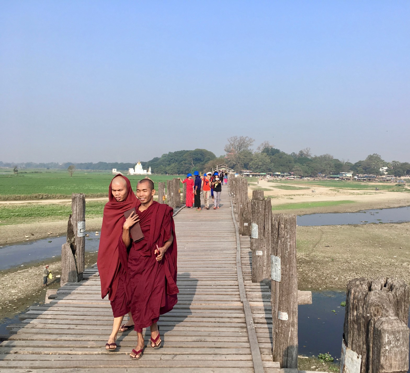 Sábado. Acordamos cedo. Dia de partir de Myanmar. Aproveitamos que teríamos que pagar um transfer até o aeroporto e pedimos ao motorista parar em dois lugares no caminho. Não poderíamos deixar Mandalay sem passar pela U bridge e pelo monastério. Chegamos tarde para ver o nascer do sol, mas a vista ainda era inspiradora. A ponte é feita de madeira, cobre um lago e um campo de produção de milho e arroz. Os monges trafegam muito por ali, quando querem ir do mosteiro para a cidade. O mosteiro estava todo aberto e caminhamos pelos quatro cantos. Parece uma universidade, mas muito mais simples, rústica e até certo ponto, insalubre. Os banheiros são rudimentares, não tem acento sanitário e cada estudante tem uma bacia com seus pertences básico sobre os muros do banheiro. É um lugar bem silencioso. Achei que nossa presença pudesse chamar atenção e distrai-los. Pelo contrário, nos sentimos transparentes. Alguns estudantes andavam de um lado para o outro lendo algo em voz alta. Encontramos a escola primária de budismo. As salas de aulas eram fechadas em três paredes. Uma parede aberta dava a impressão que aquilo era um cenário de programa de televisão. Você, ali, parece literalmente um telespectador assistindo o que acontece na sala. Algumas vezes um longe mais velho entrega no meio da aula e dizia alguma coisa. Em uma dessas intervenções, ele pegou minha filha no colo e levou até a sala de aula. E conversou com ela, com as crianças. A língua era local, não pude entender. Nesse momento pude observar algumas placas espalhadas pelo pátio, umas escritas “Honestidade”, outra “oportunidades iguais”. Era o que todas aqueles minis monges, todos vestidos de vermelho vinho, estavam aprendendo. Essa foi uma experiência e tanto. Me senti num ambiente onde todos ali estavam, a meu ver, justamente vivendo uma vida oposta da minha. Sem nenhum apego material, sem qualquer preocupação na cabeça. Foi quando me lembrei da conversa com o monge em São Paulo. O monastério com seu clima inspirador de aprendizagem foi um ápice nessa viagem.