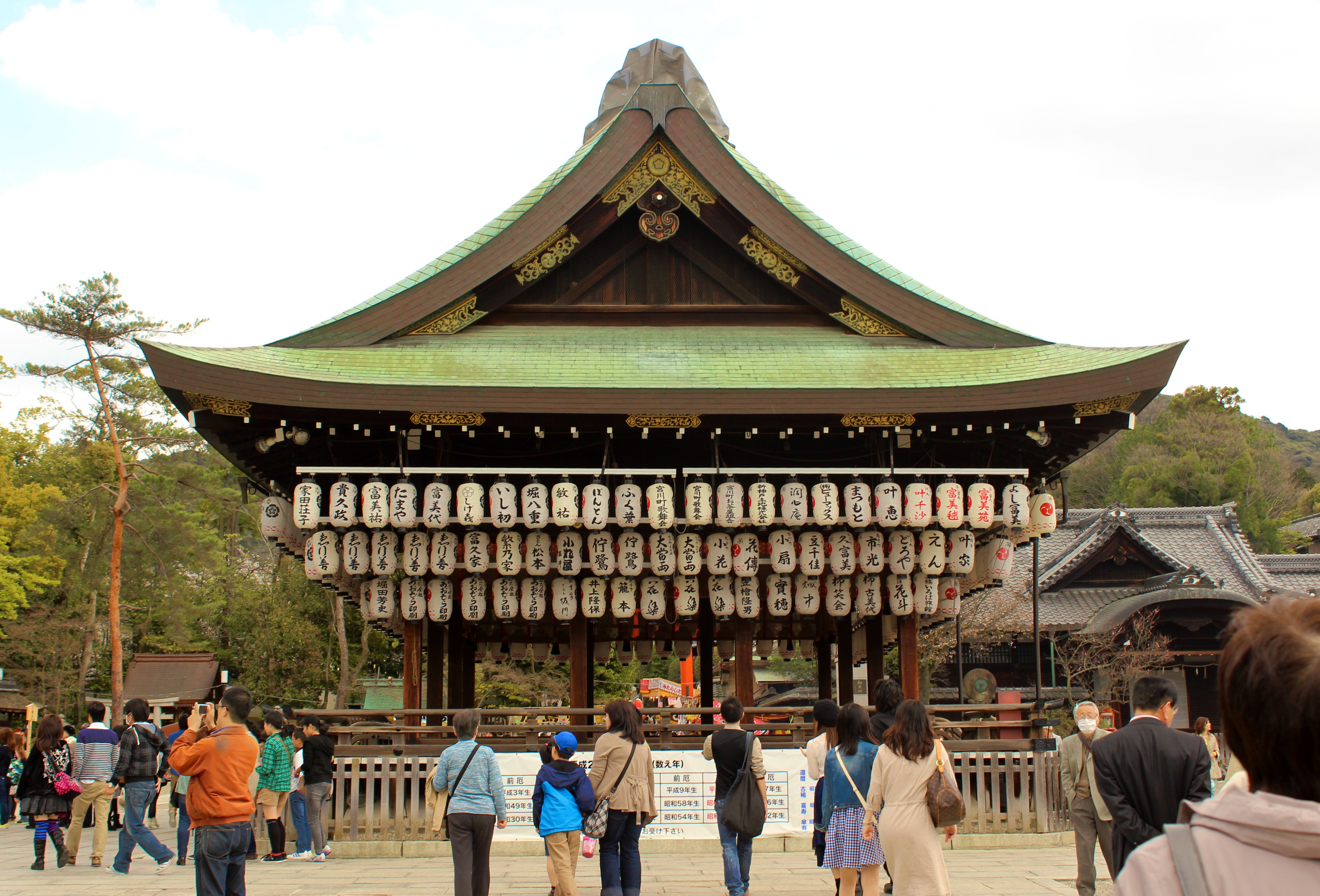 Depois do templo, pedimos uma parada para o café da manha. Havíamos saído de Osaka sem nada no estômago. Havíamos priorizado o café da manha de nossa menina, e essas coisas só entende quem tem filhos. Masa, que já havia morado em Kyoto por um ano, recomendou que deixássemos o carro no local da próxima visita. Dali poderíamos encontrar uma cafeteira. Não demorou muito e encontramos uma Starbucks. Starbucks também tem em tudo quanto é lugar no Japão. Kyoto não ficaria de fora. Dali seguimos então para o Yasaka Shrine, um santuário Shintoista, religião japonesa mais antiga que o budismo. Tivemos uma breve Cherry Blossom no parque do santuário. “Esse parque é o lugar onde as pessoas vem na noite de ano novo”. “Elas se despedem do ano anterior e fazem desejos para o ano seguinte..”. Vocês querem rezar como os japoneses?”, perguntou Harumi. A July, com nossa menina no colo, entrou na fila e seguiu o ritual, copiando a Harumi. Fiquei bastante curioso para saber afinal pelo que as pessoas rezam, mas guardei comigo a pergunta. Faria ela em outra hora.